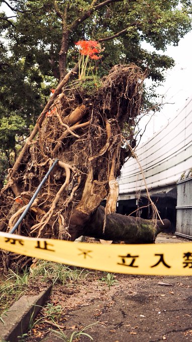 台風で倒れた木の根から咲く彼岸花が 世界の破滅後に咲く花 みたいな